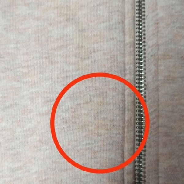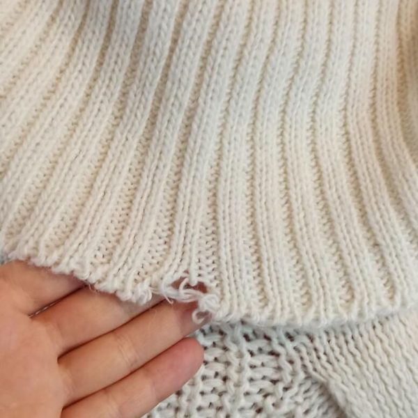 Спереди разошлась нитка(ветка), под левым рукавом маленькая дырочка